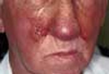 The patient reported that he had noticed the facial eruption a couple of months earlier. On examination, the lesion appeared more plaque-like and dense than is typical of rosacea. The differential diagnosis included lupus, mycosis fungoides, rosacea, and angiosarcoma.