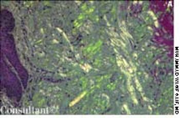 A 5-day history of pain and swelling in the right third finger (A) were the complaints of a 76-year-old man. A few days earlier, another physician had prescribed indomethacin, 25 mg tid, but it had not helped, and the patient believed that his condition had worsened. He had had an attack of gout 5 years before but had not been taking any maintenance medication. The distal interphalangeal (DIP) joint of the affected finger was now erythematous and tender, with chalky subcutaneous deposits. A diagnosis of acute gouty arthritis and gouty tophus was made.