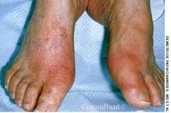 A 51-year-old woman complained of mild pain in the Achilles tendon area of both feet. This was aggravated when she stood for prolonged periods and when she wore tight, high-heeled shoes. Physical examination results were unremarkable except for a disputable palpable thickness of the Achilles tendons, especially on the right foot.