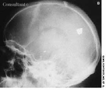 While evaluating this 26-year-old man for suspected sinusitis, skull films revealed the fragments of a 32-caliber gunshot embedded in his brain. The anteroposterior and lateral radiographs show three metallic bullet fragments; the largest remnant is on the left side of the occipitoparietal region. The patient reported being shot at age 11 but denied any residual neurologic signs.
