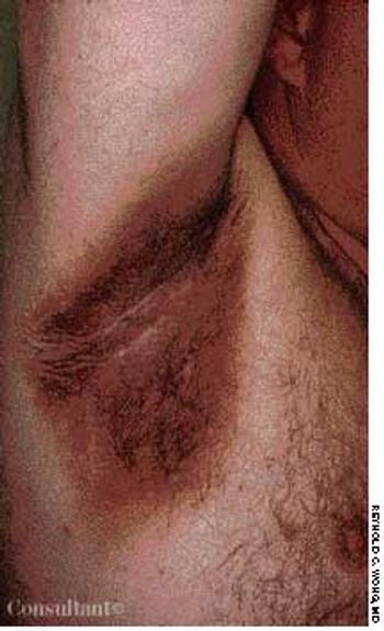 Brown-black discoloration and a soft, velvety papillomatosis of the axillary, inguinal, genital, and neck areas were seen in a 46-year-old man. He had hypertriglyceridemia, for which he had recently begun taking nicotinic acid. After a few days of therapy, he noticed the onset of this asymptomatic hyperpigmentation.