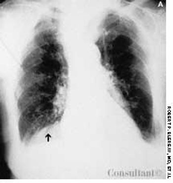A 95-year-old woman was brought to the emergency department with hemoptysis. Erect posterior-anterior (A) and lateral (B) chest films showed a density at the base of the right lung posteriorly. A CT scan (C) revealed that the mass was the right kidney above the diaphragm and adjacent to the heart. The kidney had migrated through a foramen of Bochdalek.