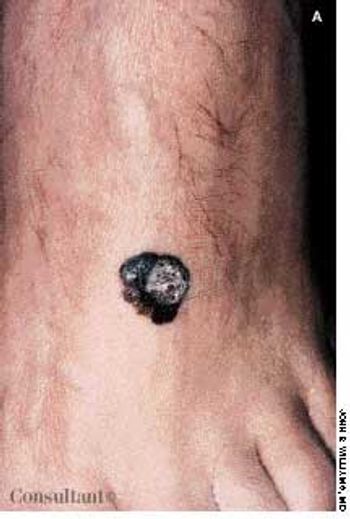 Seen here is an ulcerated tumor with irregular borders on the left foot of a 37-year-old man. He said the tumor had developed several years ago.