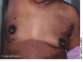 These are the breasts of a healthy 35-year-old woman as seen during a postpartum examination following delivery of twins. She had two supernumerary nipples on the right-one above and one below the normal nipple-and one supernumerary nipple on the left, superior to the normal nipple.