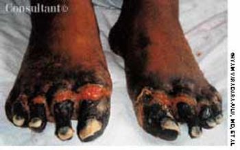 A 21-year-old man slept in a car in upstate New York for three winter nights. Discomfort and swelling of his toes developed, which progressed to marked discoloration of the digits.