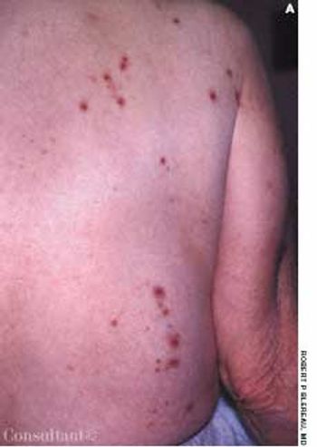 Highly pruritic, 2- to 4-mm, papular lesions with central ulceration erupted on the back of a 66-year-old woman. She had had 2 similar outbreaks in the past. The patient was taking conjugated estrogens, alprazolam, and alendronate.
