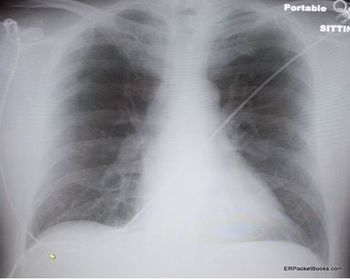 The symptoms have worsened over a 2-month period. Past medical history is unremarkable. Here, review the ED chest x-ray film and ECG. Do you see any clues to a diagnosis?