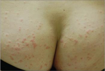 This pruritic eruption appeared on the arms, thighs, and buttocks of a 28-year-old woman after the uneventful delivery of her second child.