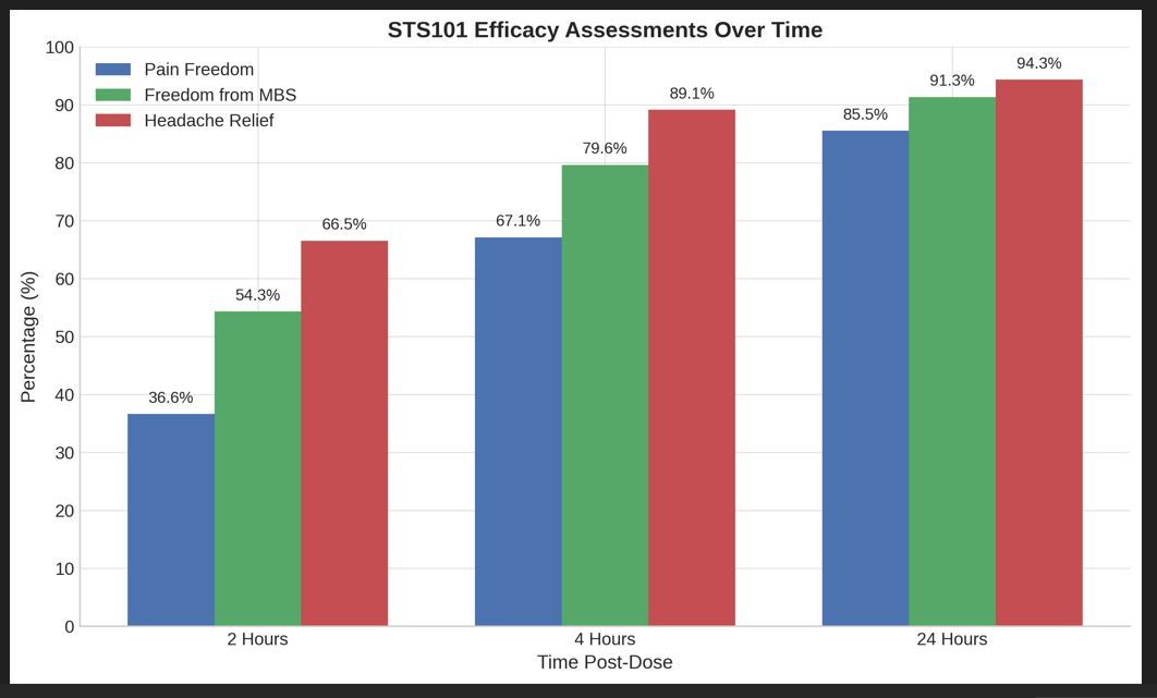 The safety profile of STS101 was comparable to that of the previously available dihydroergotamine 1.45 mg liquid nasal spray, which had reported rhinitis (26%), nausea (10%), vomiting (4%), dysgeusia (8%), application site reaction (6%), and dizziness (4%) as common adverse events. No new safety signals related to the novel powder formulation or delivery route were identified.2